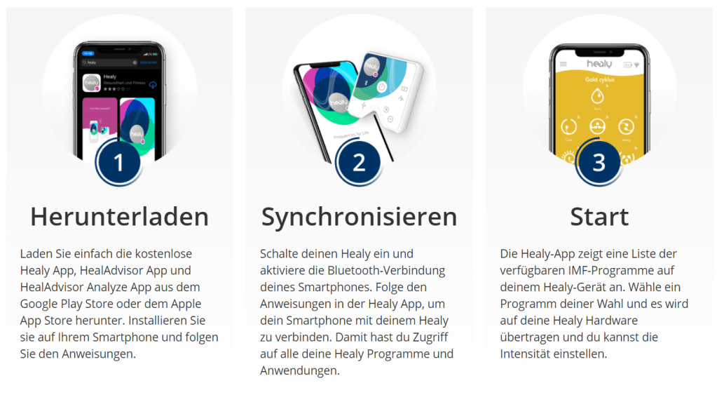 Der Healy misst die Frequenzen in der Zelle durch die Zellmembranspannung und gibt so passenden Frequenzen die der Körper in dem Moment benötigt, durch Microstrom wieder. So das ein Wohlbefinden wieder statt finden kann. Schmerzen können verschwinden, dadurch das Sauerstoff in der Zelle wieder mehr produziert werden kann durch die erhöhte ATP Produktion.